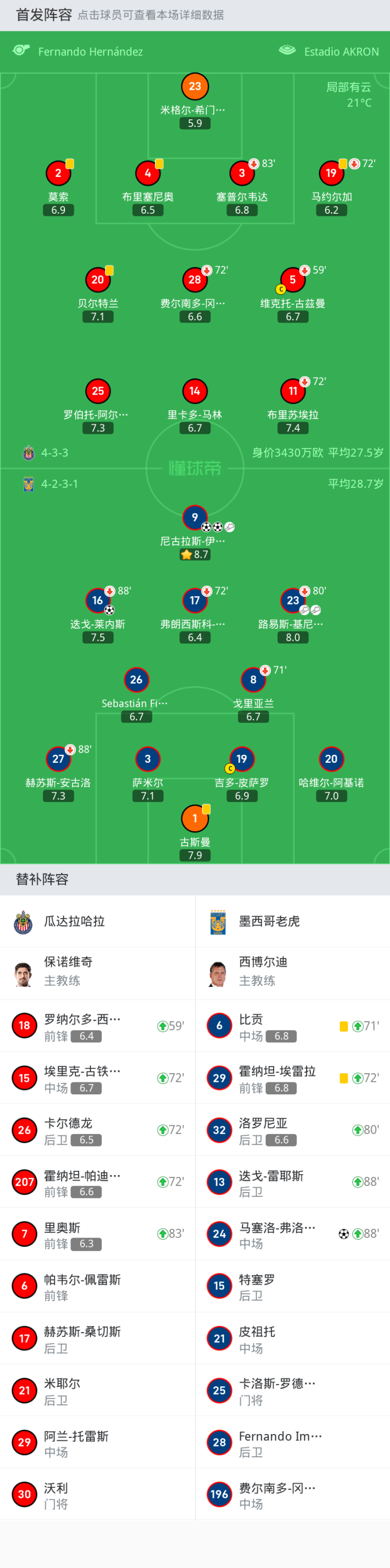 瓜达拉哈拉首发:11-布里苏埃拉, 23-米格尔-希门尼斯, 4-布里塞尼奥, 28-费尔南多-冈萨雷斯, 25-罗伯托-阿尔瓦拉多, 5-维克托-古兹曼, 2-莫索, 14-里卡多-马林, 19-马约尔加, 20-贝尔特兰, 3-塞普尔韦达