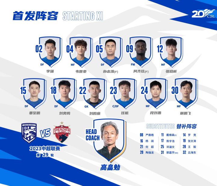 2-李扬、4-韦世豪、5-朴志洙(46′ 11-戴维森)、9-阿齐兹、12-张晓彬、15-姜至鹏(76′ 32-吕海东)、18-刘奕鸣(80′ 19-张文涛)、22-刘殿座、23-任航、24-段刘愚(63′ 8-严鼎皓)、30-谢鹏飞(63′ 29-陶强龙)