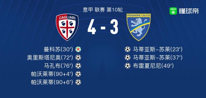 北京时间10月29日意甲 联赛 第10轮,卡利亚里主场对阵弗罗西诺内。卡利亚里奥里斯塔尼奥破门,马孔布破门,帕沃莱蒂梅开二度。弗罗西诺内马蒂亚斯-苏莱梅开二度,布雷夏尼尼破门。最终比分4-3。