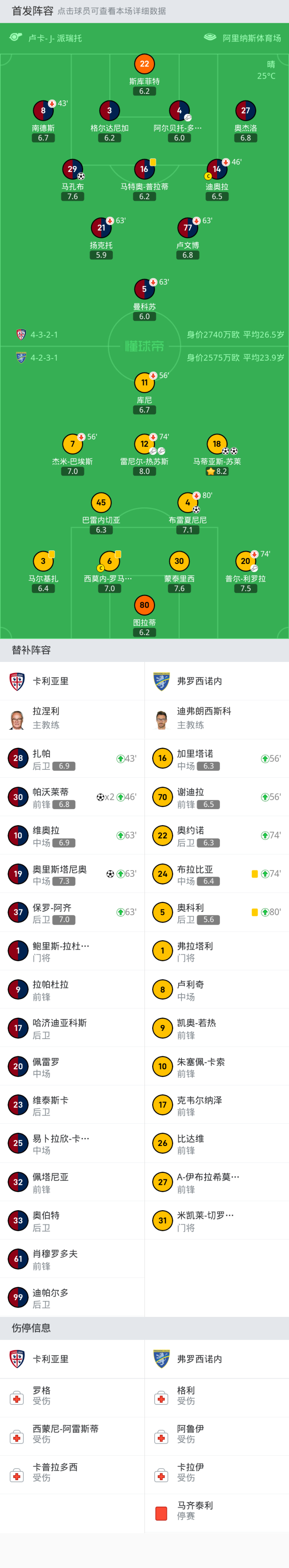 弗罗西诺内首发:6-西莫内-罗马尼奥利, 7-杰米-巴埃斯, 3-马尔基扎, 20-普尔-利罗拉, 80-图拉蒂, 4-布雷夏尼尼, 11-库尼, 12-雷尼尔-热苏斯, 45-巴雷内切亚, 30-蒙泰里西, 18-马蒂亚斯-苏莱
