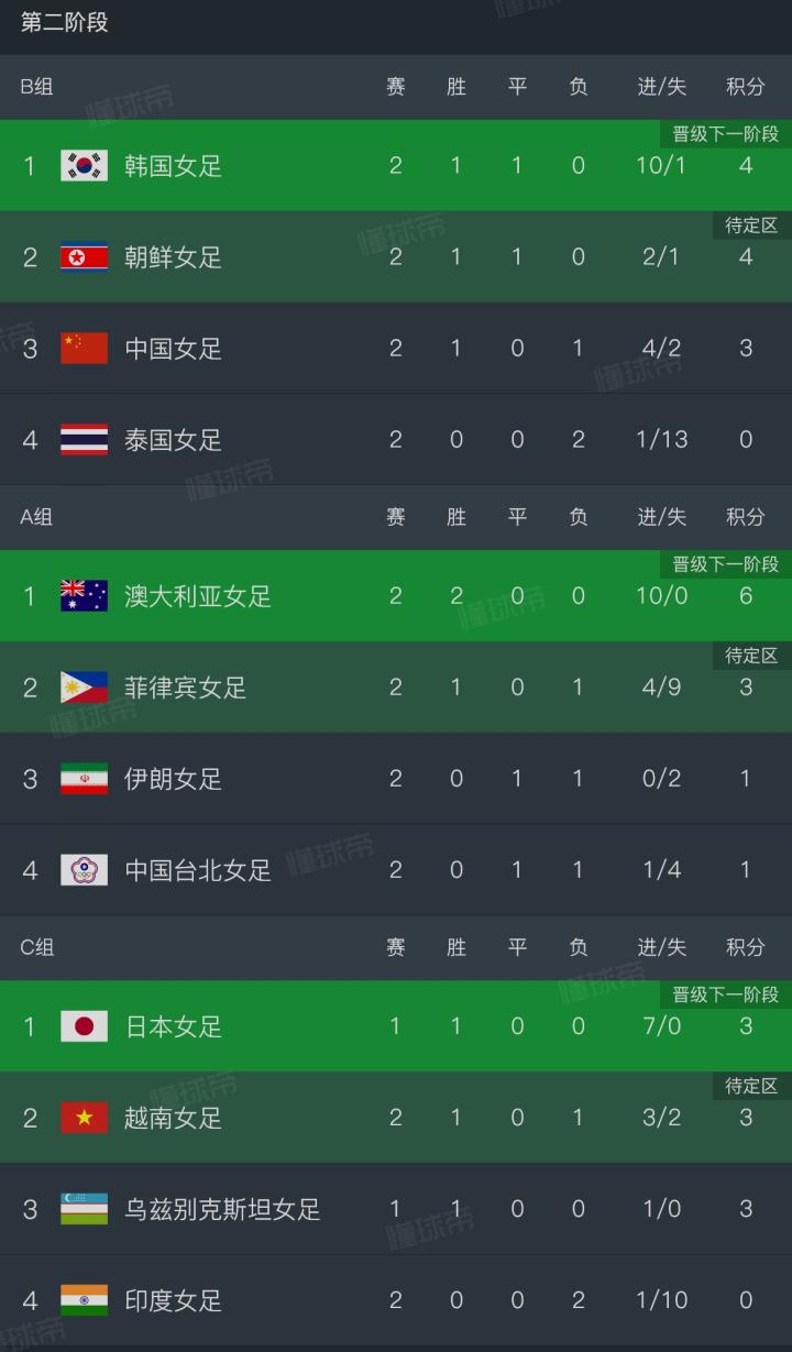 此前结束的比赛,朝鲜女足与韩国女足0-0战平,两队各积4分为例小组前二,由于韩国女足对泰国女足刷了9个净胜球所以排名第一。