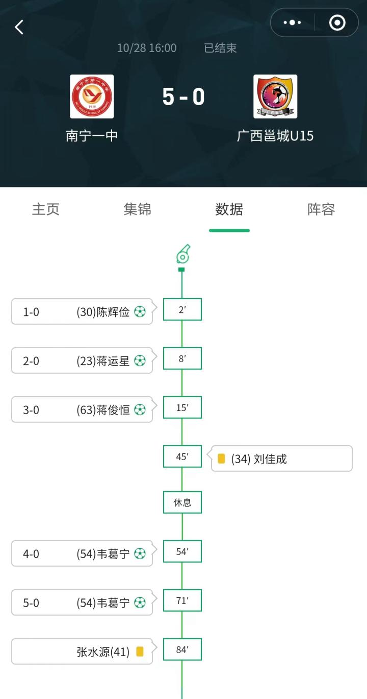 10月28日16:00,南宁一中五象校区高中部,南超第三轮,南宁一中对阵广西邕城U15,两支00后青年军的对话。南宁一中派出轮换阵容,掌握比赛节奏,前15分钟,陈辉俭、蒋运星、蒋俊恒帮助南宁一中连下三城,下半场韦葛宁梅开二度,最终南宁一中5-0击败广西邕城U15,同样拿到赛季首胜。