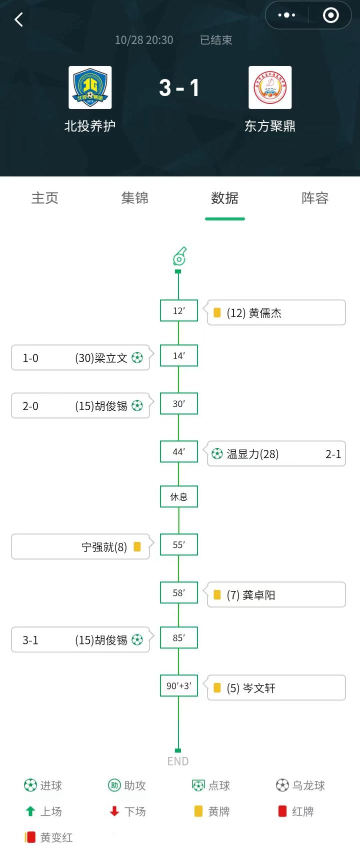 10月28日20:30,广西体育中心一号场,南超第三轮,北投养护对阵东方聚鼎。第14分钟,北投队长梁立文30米任意球造成对方门将黄油手漏入球门,1-0;第30分钟,梁立文直塞,胡俊锡前插捅射破门,将比分改写为2-0;第44分钟,东方聚鼎打出精妙配合,00后小将温显力打近角扳回一分,1-2,这个球也是北投养护赛季的首个失球;下半场第85分钟,胡俊锡小角度任意球直接破门,梅开二度锁定胜局,北投养护3-1击败东方聚鼎,三连胜领跑积分榜。