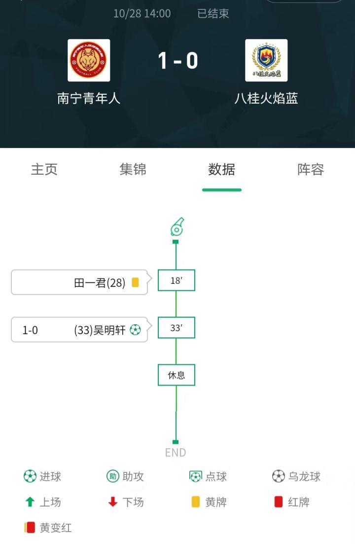 10月28日14:00,南宁一中五象校区高中部,南超第三轮,南宁青年人对阵八桂火焰蓝。两支球队互有攻守,比赛第33分钟,南宁青年人05年小将马俊飞鸿左路连续爆破突入禁区打门被立柱挡出,33号吴明轩补射攻入制胜进球。最终南宁青年人1-0击败八桂火焰蓝,拿到本赛季的首场胜利,八桂火焰蓝的连胜势头也就此被抑制。