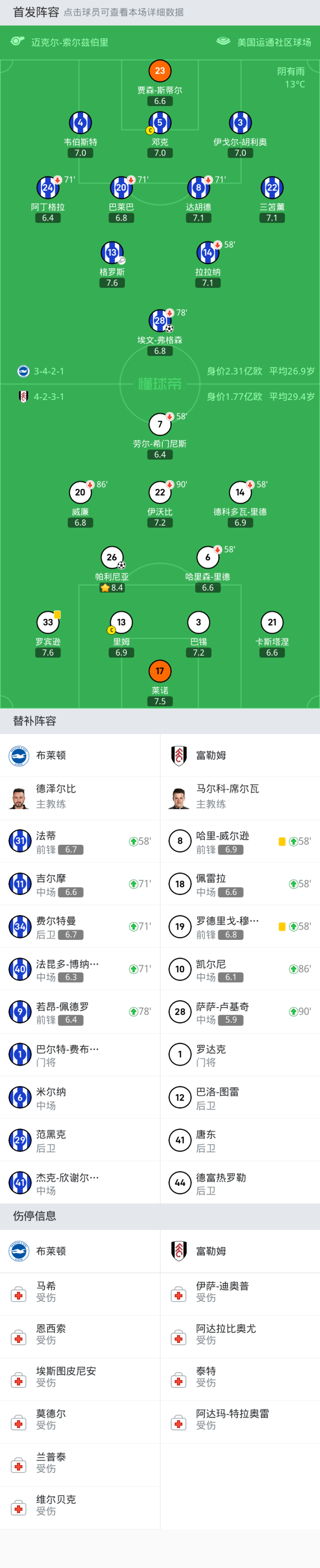 布莱顿首发:14-拉拉纳, 23-贾森-斯蒂尔, 4-韦伯斯特, 13-格罗斯, 5-邓克, 8-达胡德, 3-伊戈尔-胡利奥, 22-三笘薰, 28-埃文-弗格森, 24-阿丁格拉, 20-巴莱巴