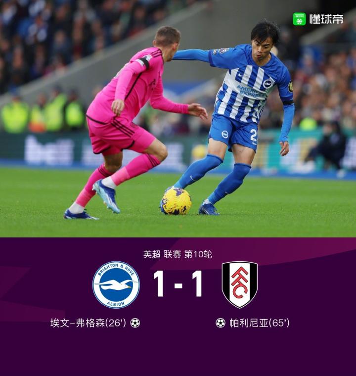 北京时间10月29日英超 联赛 第10轮,布莱顿主场对阵富勒姆。上半场布莱顿埃文-弗格森破门,下半场邓克击中横梁,富勒姆帕利尼亚破门,最终两队1-1战平。
