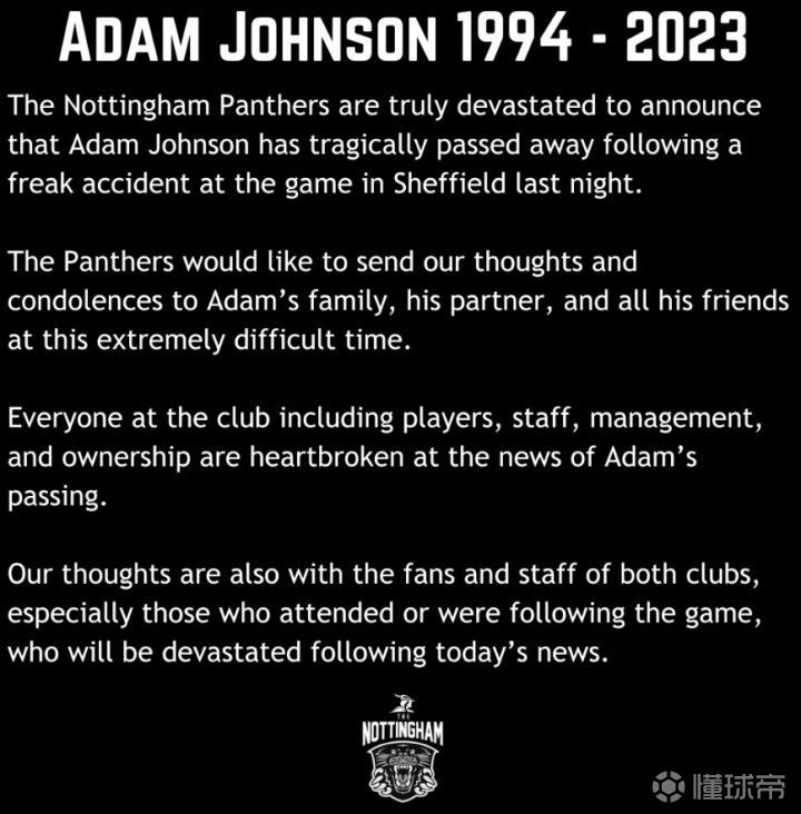 约克郡救护服务中心的一位发言人表示,在“冰上事故”后,他们于晚上8点21分被叫去谢菲尔德体育场,两辆救护车和一名重症监护护理人员到达现场,有一名伤员在现场接受治疗并被送往医院。当地时间29日,医院宣布他不治身亡,随后诺丁汉黑豹队发布讣告宣布亚当-约翰逊逝世。