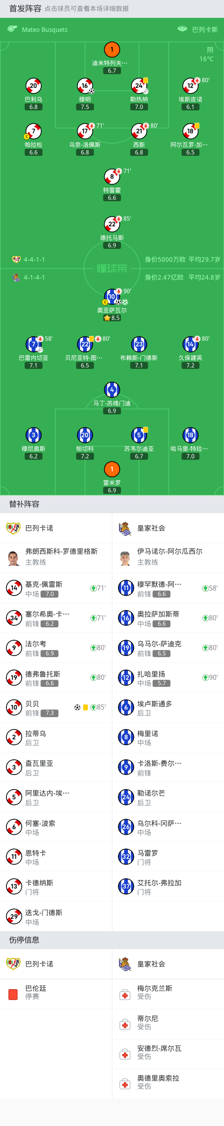 巴列卡诺首发:8-特雷霍, 24-勒热纳, 22-德托马斯, 1-迪米特列夫斯基, 20-巴利乌, 17-乌奈-洛佩斯, 18-阿尔瓦罗-加西亚, 12-埃斯皮诺, 7-帕拉松, 16-穆明, 21-西斯