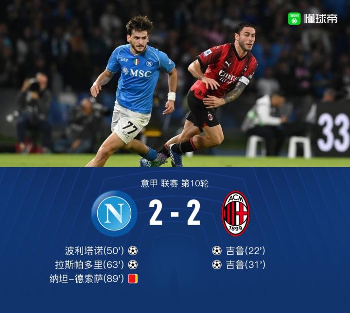 北京时间10月30日意甲联赛第10轮,那不勒斯主场对阵AC米兰。上半场,卡卢卢因伤无法坚持,佩莱格里诺替补上演首秀。随后,吉鲁头球两度攻破那不勒斯球门。下半场风云突变,波利塔诺爆射扳回一城,拉斯帕多里通过任意球扳平比分。比赛尾声阶段,纳坦-德索萨犯规吃到第二张黄牌被罚下。全场比赛结束,米兰2-2战平那不勒斯,遭遇各项赛事三场不胜。