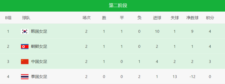 此前2轮,中国女足先是1-2不敌朝鲜女足,然后3-0战胜泰国女足。目前,中国女足积3分,位列B组积分榜第3,韩国女足、朝鲜女足同积4分,分列前2名。