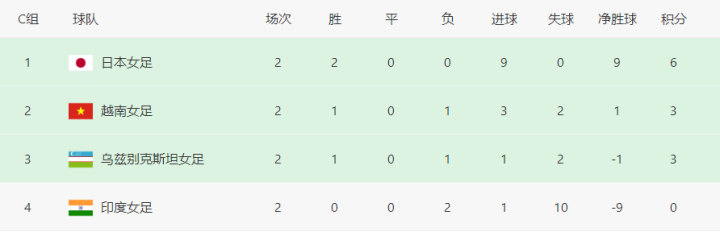 但C组却存在竞争对手,赛前,越南女足、乌兹别克斯坦女足同积3分,净胜球分别为1、-1。末轮,越南女足将对阵日本女足,赢球概率很低。但乌兹别克斯坦女足将对阵排名垫底的印度女足,大概率会取胜。这样的话,乌兹别克斯坦女足也将积6分,就将和中国女足比较净胜球。这就是一个很微妙的态势了。