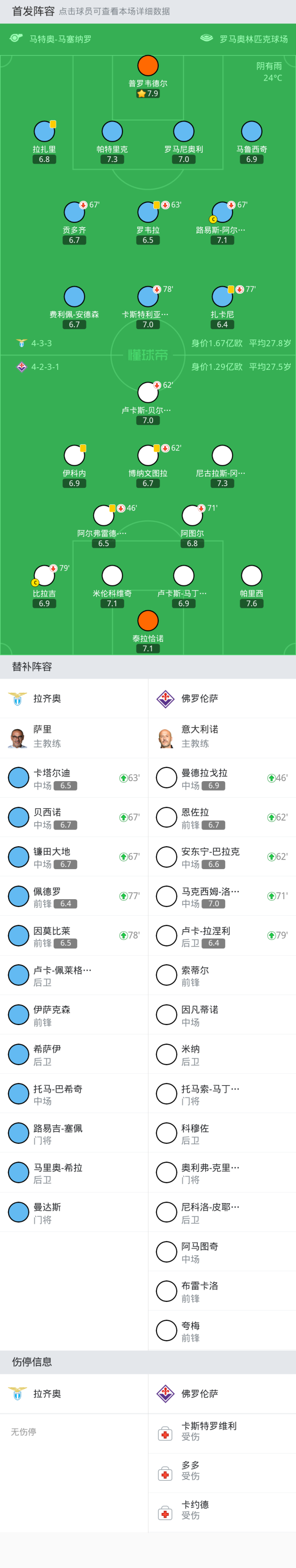 拉齐奥首发:10-路易斯-阿尔贝托, 7-费利佩-安德森, 4-帕特里克, 13-罗马尼奥利, 29-拉扎里, 77-马鲁西奇, 20-扎卡尼, 94-普罗韦德尔, 8-贡多齐, 19-卡斯特利亚诺斯, 65-罗韦拉