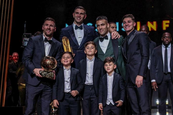 阿根廷男孩们,梅西和3个儿子与劳塔罗、大马丁、小蜘蛛合影ETChalmers @懂球帝2023-10-31 06:48金球奖颁奖典礼上,第八次获得金球奖的梅西和三个儿子与阿根廷队友们合影。2023年金球奖颁奖典礼上,阿根廷球员凭借去年世界杯夺冠的表现收获个人荣誉。梅西第八次获得金球奖,门将达米安-马丁内斯获得雅辛奖,入围金球奖候选名单的劳塔罗和阿尔瓦雷斯也出席颁奖典礼,并坐在梅西旁边。颁奖典礼上,梅西和他的三个儿子与三位阿根廷队友合影留念。展开更多