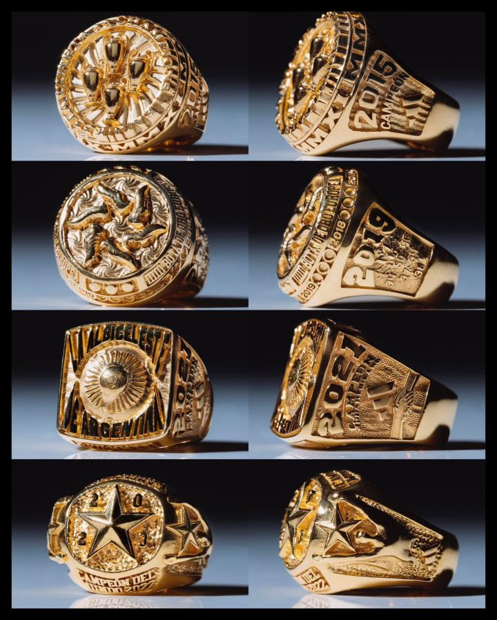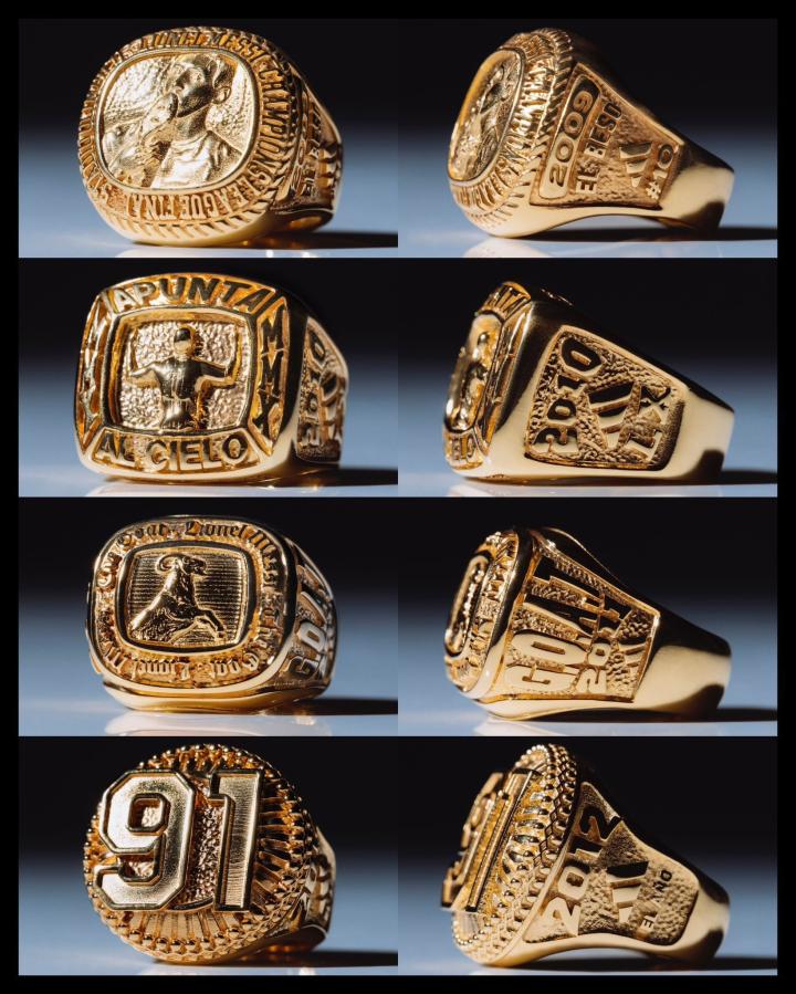 而且每一枚戒指的造型和图案都各不相同,每一枚戒指上都有梅西获奖的年份,还有GOAT、山羊、91球、标志性庆祝动作等元素。