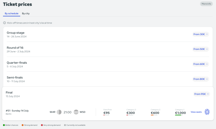 欧足联赛事首席执行官马丁-卡伦(Martin Kallen)表示:“人们对2024年欧洲杯的期待与日俱增。大量的门票申请证明了这项赛事持续的吸引力和世界各地球迷的兴趣。”