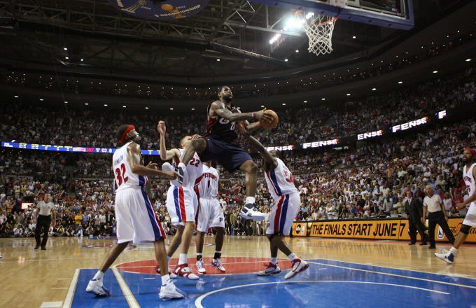 和历史上那个23号一样,身穿骑士23号球衣的詹姆斯,也要先经历活塞的洗礼。2005-06赛季,詹姆斯第一次率骑士闯入季后赛,就在东部半决赛3-4不敌活塞。但在2006-07赛季,詹姆斯就率队4-2跨过活塞,进军总决赛。系列赛G5,詹姆斯率队与活塞鏖战双加时,从末节2分钟开始,他独得骑士最后25分,如天神下凡。