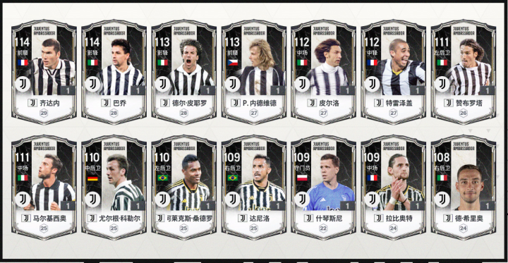 巴乔、齐达内领衔,尤文图斯大使(JA)赛季震撼来袭!齐达内、巴乔为最高能力值114;内德维德和皮耶罗能力值113;能力值最低的德·希里奥也有108能力值。