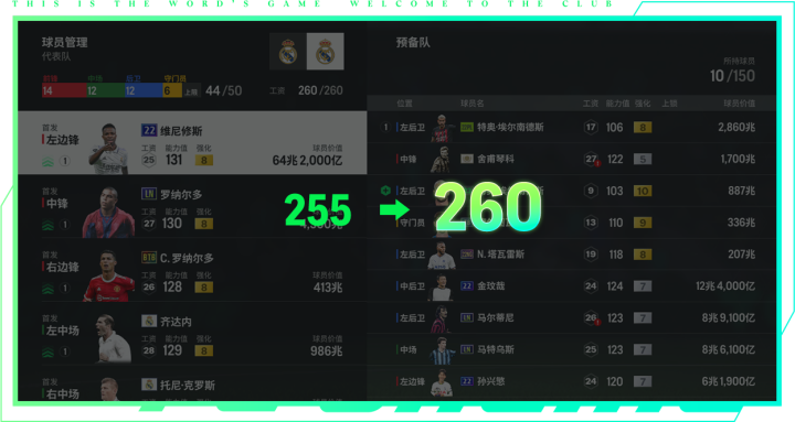 本次工资帽涨了5点,变成260工资,玩家们能在更宽松的工资范围内,搭配不同阵容。