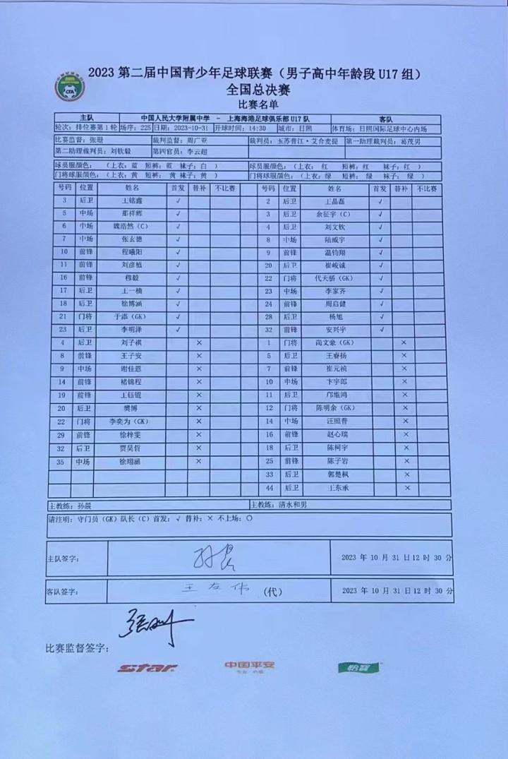 2023年第二届中国青少年足球联赛(男子高中年龄段U17组)全国总决赛排位赛第一轮,#上海海港u17# 2比0战胜中国人民大学附属中学,晋级下一阶段全国8强赛!上半场,利用一次角球机会,温钧翔破门得分;下半场同样角球传中,刘文钦进行二次补射破门!守门员代天骄获评本场最佳球员。 上一场比赛,一号守门员尚文豪遭遇伤情,遗憾无缘之后的比赛。此役,队友们带着尚文豪的球衣一同入场,也是带着他的份凝心聚力、努力拼搏,同时祝愿他早日康复!
