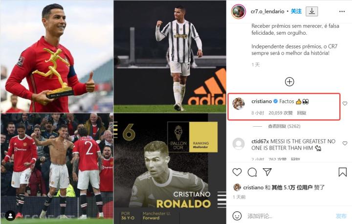 而在2021年金球奖颁发给梅西后,C罗本人点赞了一条球迷所发的“梅西能够获得金球就是耻辱”的帖子,并评论道:事实(factos),且配上了点赞和眼睛的表情。