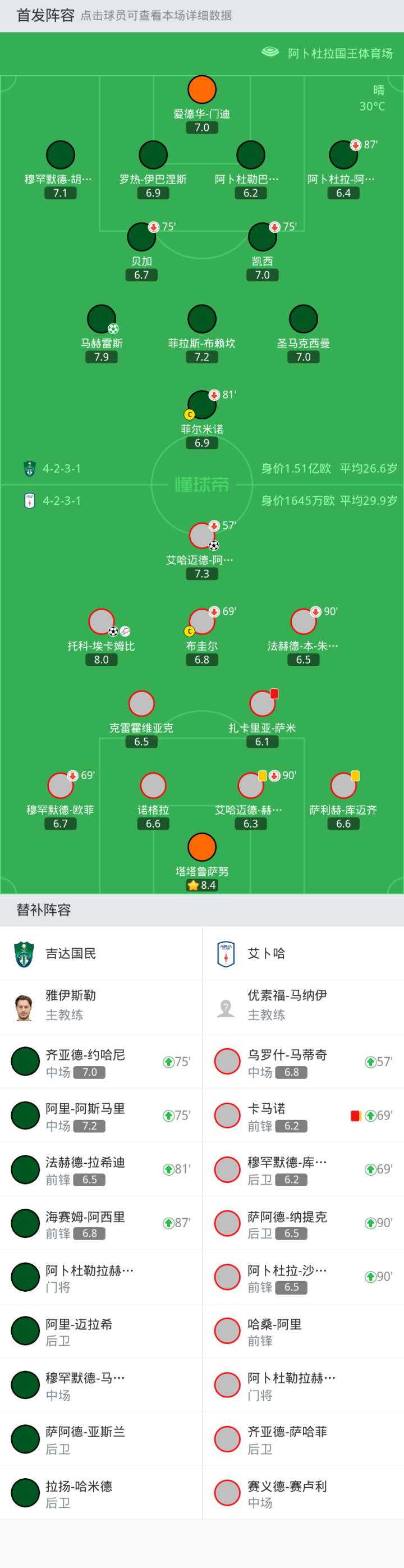 替换下场:69'10-布圭尔, 90'+16-艾哈迈德-赫贝亚卜, 90'+114-法赫德-本-朱马亚, 69'24-穆罕默德-欧菲, 57'71-艾哈迈德-阿卜杜
