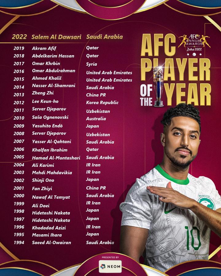 2022年亚洲足球先生候选3人为达瓦萨里(沙特)、莫埃兹-阿里(卡塔尔)、马修-莱基(澳大利亚)。