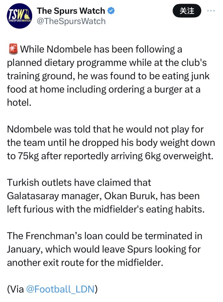 据悉,加拉塔萨雷主帅布鲁克对于自己的手下非常不满,恩东贝莱不仅超重,还偷吃汉堡。