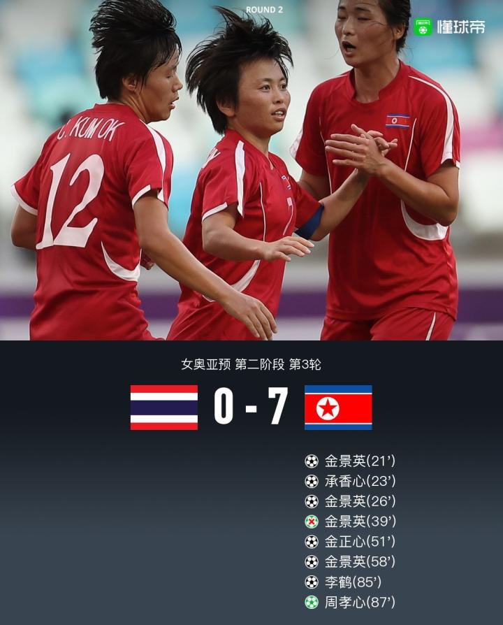 朝鲜女足7-0狂胜泰国女足晋级奥亚预最后阶段,金景英戴帽