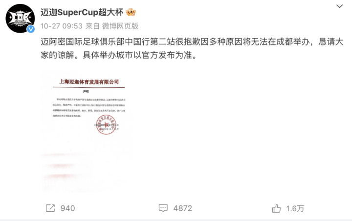 因此在没有拿到赛事审批,甚至没有与两支国内参赛球队完全达成一致的情况下,就官宣中国行安排的迈伽体育,最终不得不咽下临时更改比赛地点的苦果——10月26日,迈阿密国际中国行的更新行程,原定设在青岛的比赛改换至海口;10月27日,迈伽体育官宣中国行第二站将无法在成都举办,具体比赛城市待定。