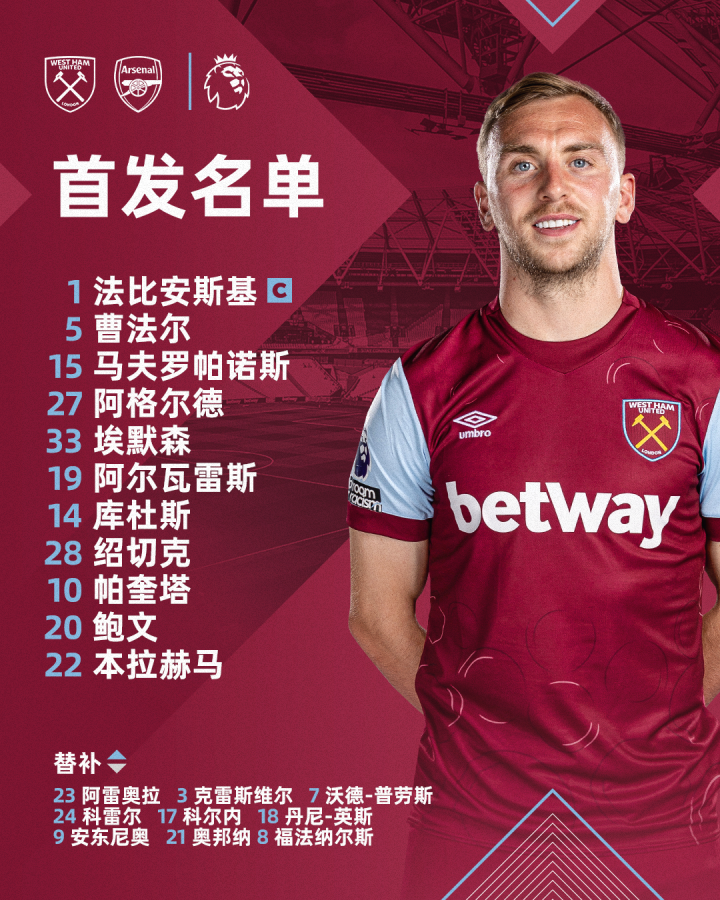 ⚒首发公布丨西汉姆联vs阿森纳法比安斯基坐镇门将...西汉姆联足球俱乐部 @懂球帝2023-11-02 02:36⚒首发公布丨西汉姆联vs阿森纳 法比安斯基坐镇门将,库杜斯再次先发 𝐂𝐎𝐌𝐄 𝐎𝐍 𝐘𝐎𝐔 𝐈𝐑𝐎𝐍𝐒⚒️展开更多