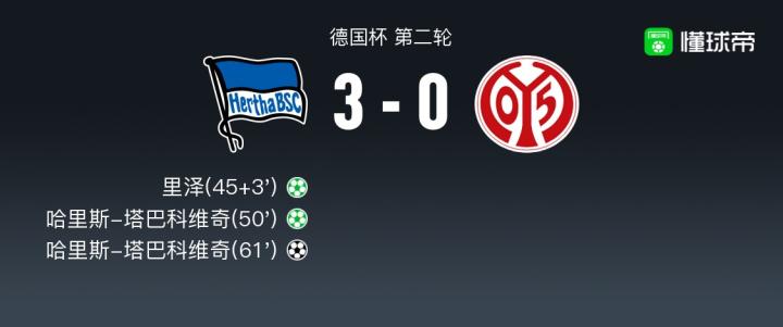 北京时间11月02日德国杯 第二轮,柏林赫塔主场对阵美因茨。柏林赫塔里泽破门,哈里斯-塔巴科维奇梅开二度。美因茨。最终比分3-0。