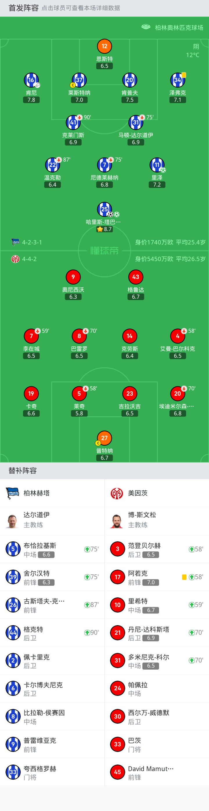 柏林赫塔3-0大胜美因茨,哈里斯-塔巴科维奇梅开二度,里泽点射