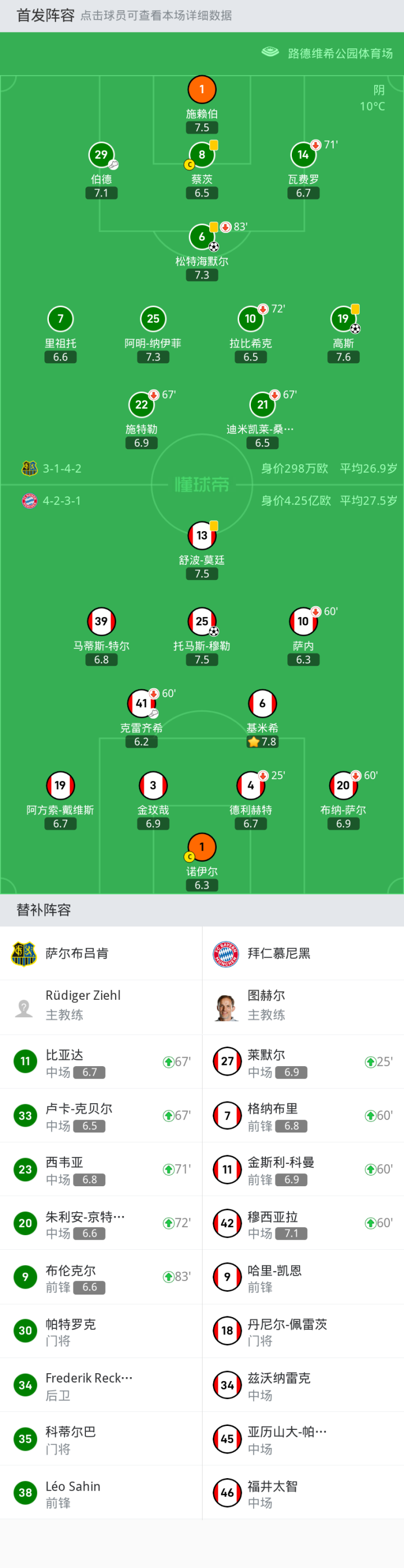 替换下场:60'20-布纳-萨尔, 60'10-萨内, 25'4-德利赫特, 60'41-克雷齐希