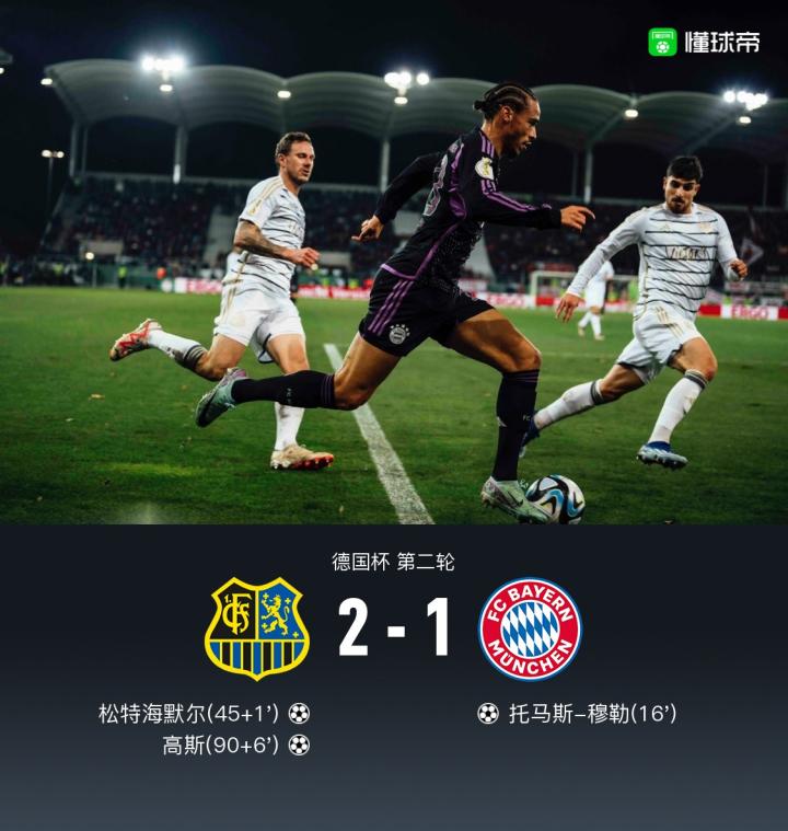 北京时间11月02日德国杯第二轮,德丙球队萨尔布吕肯主场对阵拜仁慕尼黑。上半场,穆勒禁区外突施冷箭为拜仁首开记录。随后,德利赫特受伤被莱默尔换下。半场结束前,克雷齐希后场被断球,松特海默尔推射扳平比分。下半场读秒阶段,高斯破门完成绝杀。全场比赛结束,拜仁客场1-2被萨尔布吕肯逆转淘汰,无缘德国杯下一轮。