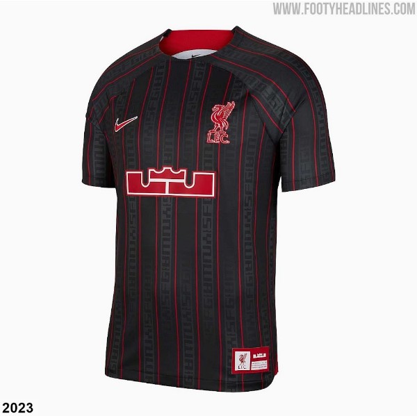 本赛季利物浦也与詹姆斯出过一件联名款球衣,配色主打红黑系,并在胸前印有巨大的詹姆斯个人Logo。