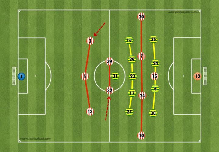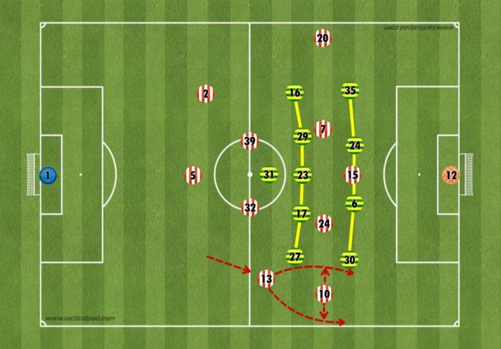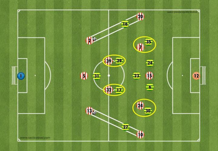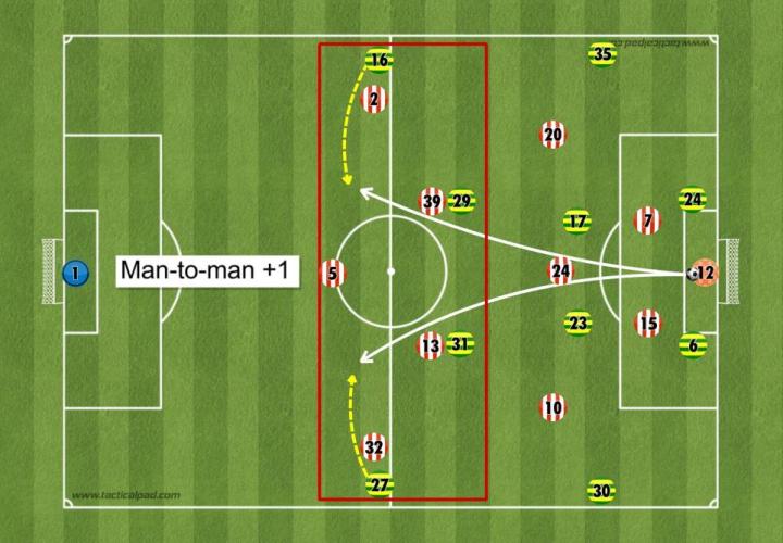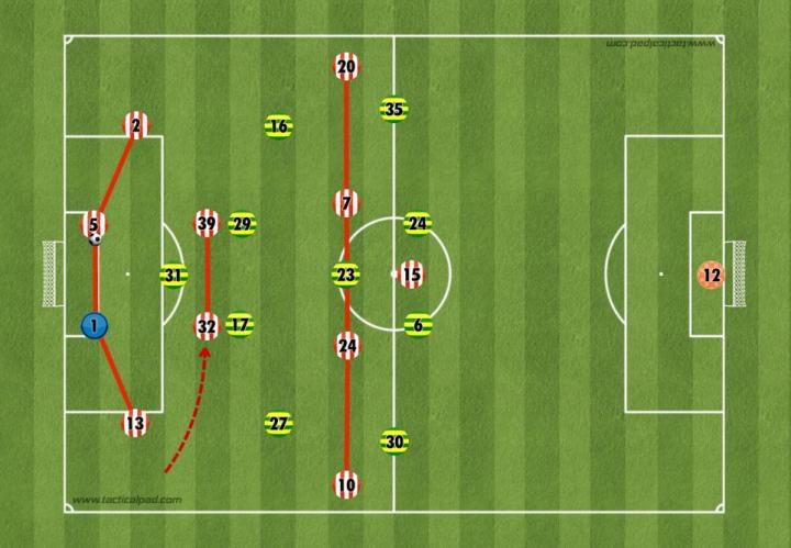 桑德兰传给边后卫的传球会吸引诺维奇边锋逼抢,从而离开位置,这时麦克莱恩或最近的诺维奇中后卫会移动到有球侧的对手球员附近。