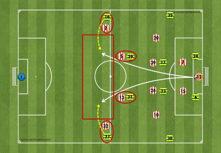 这样做的目的也很简单,就是为了利用桑德兰前场积极地人盯人留下的后场空档,来创造1V1的机会