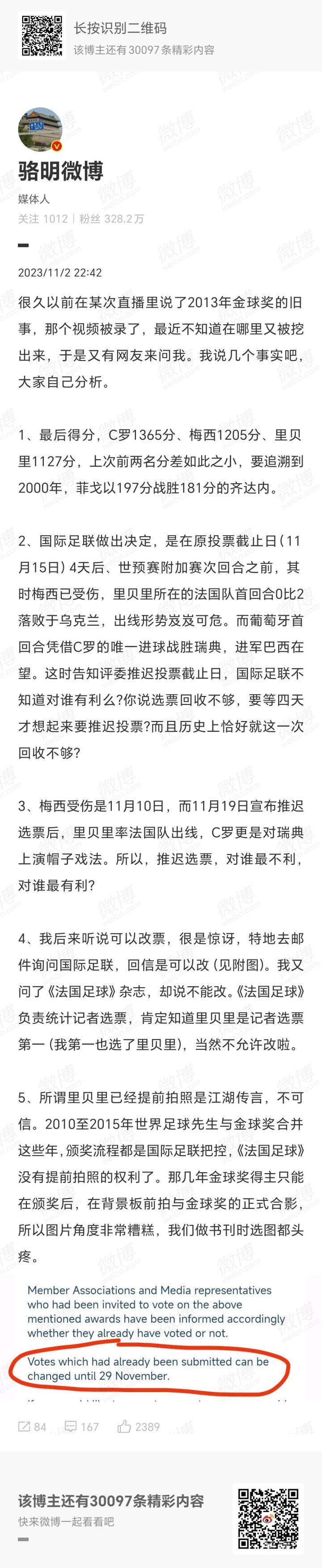 骆明:2013年金球奖里贝里是记者选票第一,最终排名C罗第一,梅西第二,里贝里第三 媒体人骆明在微博发文谈2013金球奖话题:“很久以前在某次直播里说了2013年金球奖的旧事,那个视频被录了,最近不知道在哪里又被挖出来,于是又有网友来问我。我说几个事实吧,大家自己分析。” “1、最后得分,C罗1365分、梅西1205分、里贝里1127分,上次前两名分差如此之小,要追溯到2000年,菲戈以197分战胜181分的齐达内。” “2、国际足联做出决定,是在原投票截止日(11月15日)4天后、世预赛附加赛次回合之前,其时梅西已受伤,里贝里所在的法国队首回合0比2落败于乌克兰,出线形势岌岌可危。而葡萄牙首回合凭借C罗的唯一进球战胜瑞典,进军巴西在望。这时告知评委推迟投票截止日,国际足联不知道对谁有利么?你说选票回收不够,要等四天才想起来要推迟投票?而且历史上恰好就这一次回收不够?” “3、梅西受伤是11月10日,而11月19日宣布推迟选票后,里贝里率法国队出线,C罗更是对瑞典上演帽子戏法。所以,推迟选票,对谁最不利,对谁最有利?” “4、我后来听说可以改票,很是惊讶,特地去邮件询问国际足联,回信是可以改(见附图)。我又问了《法国足球》杂志,却说不能改。《法国足球》负责统计记者选票,肯定知道里贝里是记者选票第一(我第一也选了里贝里),当然不允许改啦。” “5、所谓里贝里已经提前拍照是江湖传言,不可信。2010至2015年世界足球先生与金球奖合并这些年,颁奖流程都是国际足联把控,《法国足球》没有提前拍照的权利了。那几年金球奖得主只能在颁奖后,在背景板前拍与金球奖的正式合影,所以图片角度非常糟糕,我们做书刊时选图都头疼。”