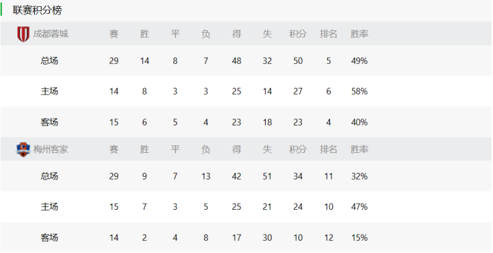 成都蓉城过往与梅州客家总共交手过7次,4胜2平1负,占据优势,上轮成都蓉城又在工体读秒绝杀了北京国安,球队正士气高涨,本轮坐镇主场对阵梅州客家,必定全力争胜,只要拿下对手,就能锁定联赛前四。