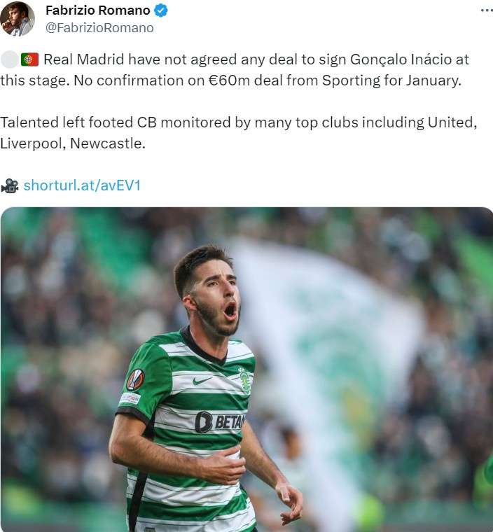 罗马诺:皇家马德里尚未就签下中卫贡萨洛-伊纳西奥...葡萄牙第一神锋迪奥戈若塔 @懂球帝2023-11-03 12:08罗马诺:皇家马德里尚未就签下中卫贡萨洛-伊纳西奥和葡萄牙体育达成协议 罗马诺写道:“目前,皇家马德里尚未就签下贡萨洛-伊纳西奥与葡萄牙体育达成任何协议。关于冬窗6000万欧签他的报价,葡体并未证实这一点。 这位才华横溢的左脚中后卫备受多家顶级俱乐部的关注,包括曼联、利物浦和纽卡斯尔联也都对他感兴趣。”展开更多