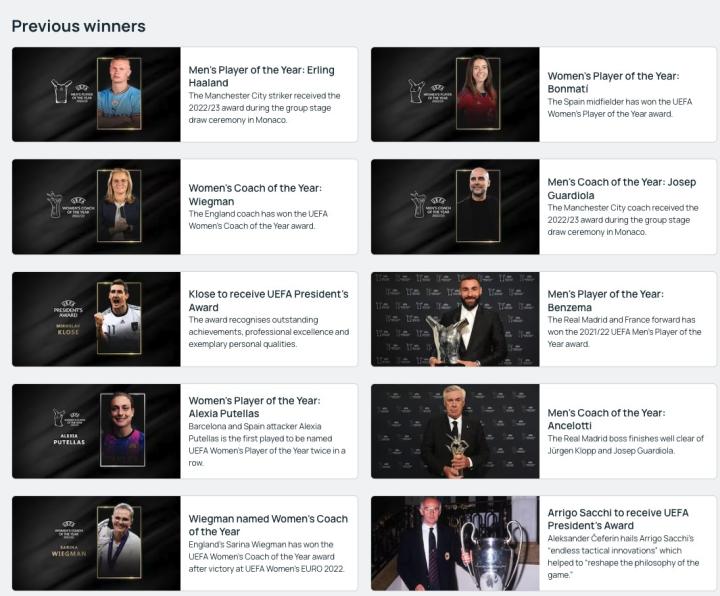 《队报》确认,欧足联将不再颁发自2011年开始设立的年度最佳球员奖项,欧足联主席切费林表示:“我们将继续颁发主席奖、欧冠最佳球员奖和欧洲杯最佳球员奖。其他奖项将与金球奖合并。我们是两个伟大的足球品牌。这里有最高荣誉的奖杯,而欧足联拥有世界上最顶尖的赛事,将两者结合是有道理的。当我们开始讨论时,进展迅速。一周内,我们就知道这是一个好主意。我们为这个项目感到高兴。所有想要获得金球奖的球员都参加了欧足联赛事。”