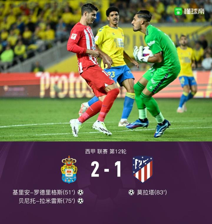 马竞1-2客负拉斯帕尔马斯,莫拉塔进球难救主,拉米雷斯破门