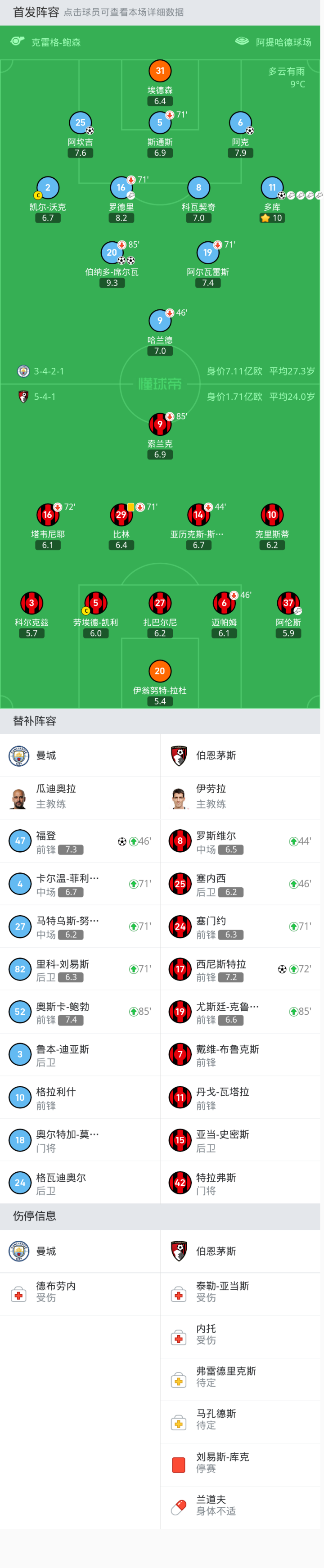 上场替补:71'4-卡尔温-菲利普斯, 46'47-福登, 71'27-马特乌斯-努内斯, 85'52-奥斯卡-鲍勃, 71'82-里科-刘易斯
