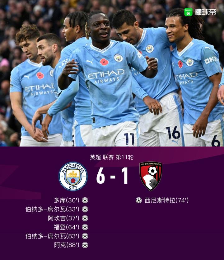 第89分钟,阿克俯身头球破门,曼城6-1伯恩茅斯