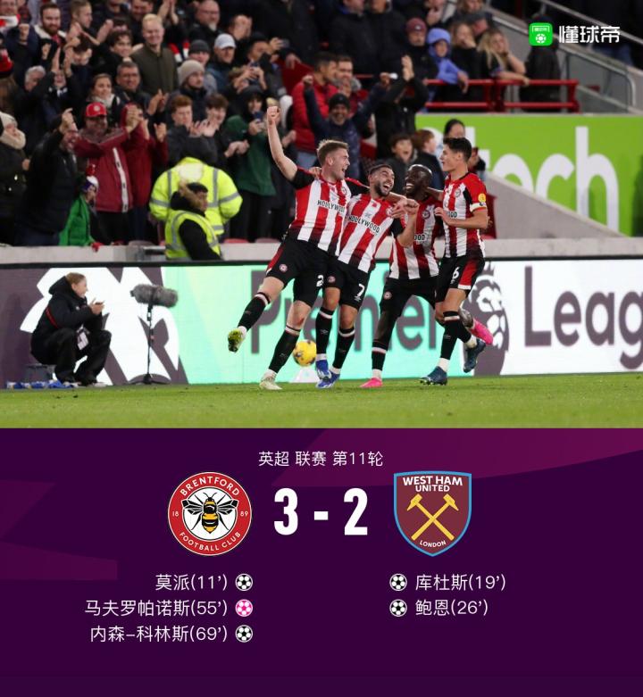 北京时间11月4日,布伦特福德在英超第11轮主场对阵西汉姆联。上半场莫派为布伦特福德首开记录,随后库杜斯和鲍恩先后破门为西汉姆联反超比分。下半场马夫罗帕诺斯自摆乌龙,内森-科林斯打进一球帮助布伦特福德再度超出,最终布伦特福德主场3-2击败西汉姆联。
