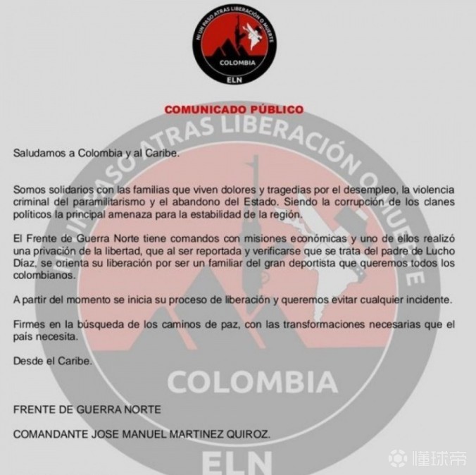 北京时间2023年11月4日,哥伦比亚民族解放游击队(ELN)由奎罗兹中校发布了一份声明,表示该组织即将释放利物浦球员迪亚斯的父亲。