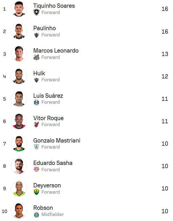 博塔弗戈当家球星蒂基尼奥-索亚雷斯、米内罗竞技前锋保利尼奥以16球并列第一