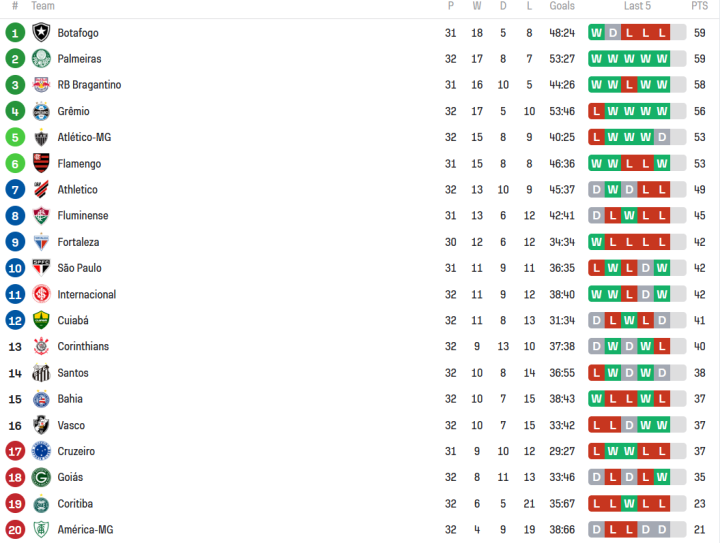 谁能想到博塔弗戈最后咬牙阶段再来一波三连败,哎,感觉气数将尽。帕尔梅拉斯、布拉甘蒂诺红牛、格雷米奥等球队都燃起夺冠希望。
