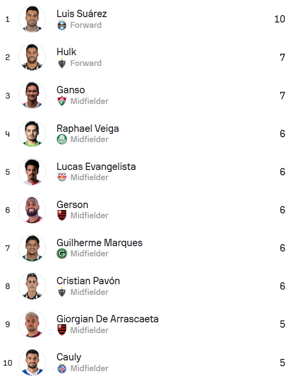 前场:德阿拉斯卡埃塔(弗拉门戈)、路易斯-阿劳霍(弗拉门戈)、恩德里克(帕尔梅拉斯)、韦加(帕尔梅拉斯)