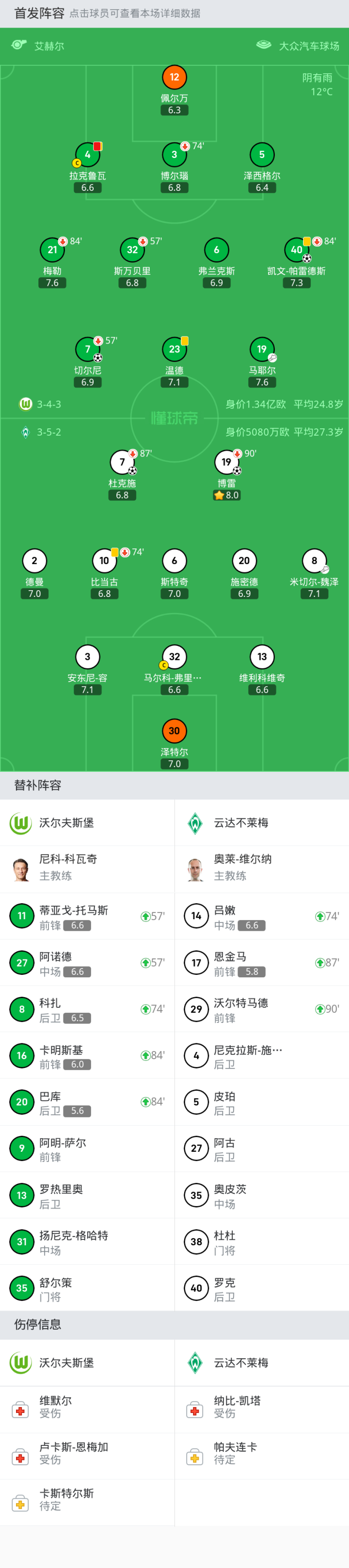 沃尔夫斯堡2-2云达不莱梅,凯文-帕雷德斯,博雷破门